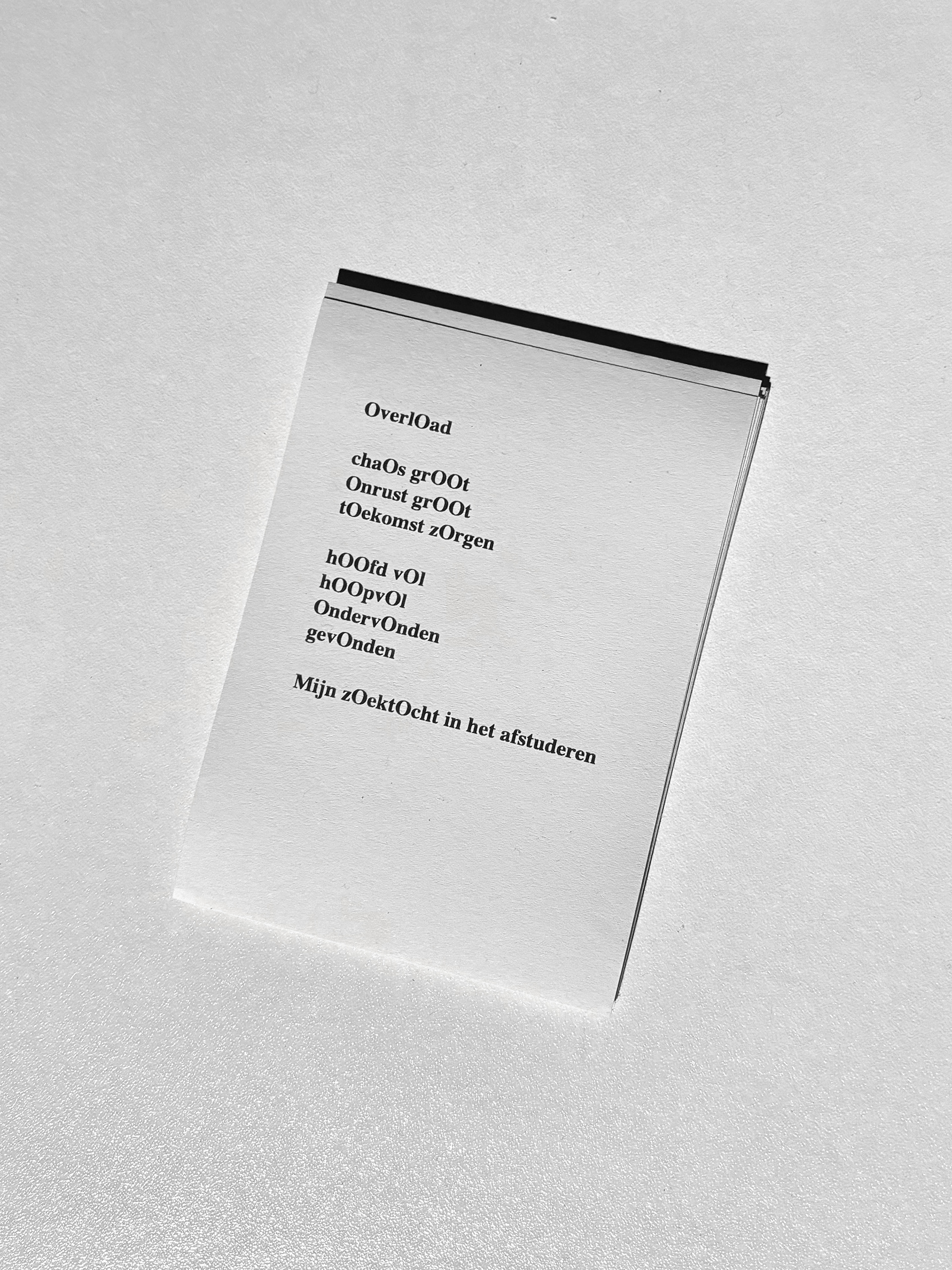 My graduation project presents a chaos of various O’s, reflecting my chaotic graduation process. I experimented and reflected a lot, ultimately choosing the O as a framework to create the necessary structure. This project combines graphic design with my love for typography and teaches me how I work, experiment, and execute assignments. Within the constraints of a project, I find my creative freedom, where creativity, intuition, experimentation, and reflection come together.